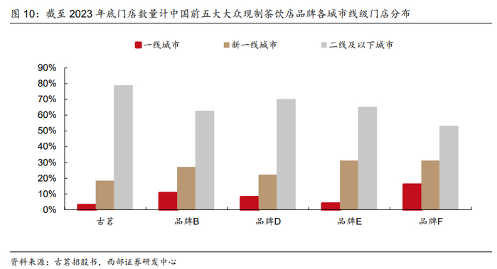 头部集中效应加剧,下沉市场成为必争之地。2023年现制茶饮品牌CR5由2020年的38.5%提升至2023年的46.8%。聚焦10-20元大众价位带,古茗门店数量最多同时GMV市占率17.7%,第一梯队品牌数量较多,龙头市占率未拉开明显差距,仍有向头部集中空间。通过对比各城市层级门店分布,该价位带各玩家二线及以下城市门店占比均在50%以上,其中古茗占比78.8%,在下沉市场具备相对规模优势。