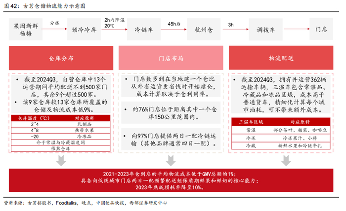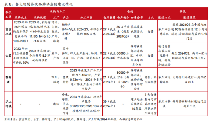 仓储物流密集组合拳,打造极致高效供应链体系。截至2024年9月30日,公司拥有22个仓库分布在华东华南区域,通过增加辐射到的门店数量发挥规模优势以降低仓储成本;同时拥有362辆三温运输车辆,精准控制各原料所需温度,缩短运输半径以降低燃油及人力成本,目前具备向低线城市门店两日一配短保质期鲜果和鲜奶的核心能力。