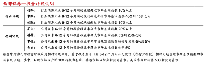 免责声明:本报告由西部证券股份有限公司(已具备中国证监会批复的证券投资咨询业务资格)制作。本报告仅供西部证券股份有限公司(以下简称“本公司”)机构客户使用。本报告在未经本公司公开披露或者同意披露前,系本公司机密材料,如非收件人(或收到的电子邮件含错误信息),请立即通知发件人,及时删除该邮件及所附报告并予以保密。发送本报告的电子邮件可能含有保密信息、版权专有信息或私人信息,未经授权者请勿针对邮件内容进行任何更改或以任何方式传播、复制、转发或以其他任何形式使用,发件人保留与该邮件相关的一切权利。同时本公司无法保证互联网传送本报告的及时、安全、无遗漏、无错误或无病毒,敬请谅解。本报告基于已公开的信息编制,但本公司对该等信息的真实性、准确性及完整性不作任何保证。本报告所载的意见、评估及预测仅为本报告出具日的观点和判断,该等意见、评估及预测在出具日外无需通知即可随时更改。在不同时期,本公司可能会发出与本报告所载意见、评估及预测不一致的研究报告。同时,本报告所指的证券或投资标的的价格、价值及投资收入可能会波动。本公司不保证本报告所含信息保持在最新状态。对于本公司其他专业人士(包括但不限于销售人员、交易人员)根据不同假设、研究方法、即时动态信息及市场表现,发表的与本报告不一致的分析评论或交易观点,本公司没有义务向本报告所有接收者进行更新。本公司对本报告所含信息可在不发出通知的情形下做出修改,投资者应当自行关注相应的更新或修改。本公司力求报告内容客观、公正,但本报告所载的观点、结论和建议仅供投资者参考之用,并非作为购买或出售证券或其他投资标的的邀请或保证。客户不应以本报告取代其独立判断或根据本报告做出决策。该等观点、建议并未考虑到获取本报告人员的具体投资目的、财务状况以及特定需求,在任何时候均不构成对客户私人投资建议。投资者应当充分考虑自身特定状况,并完整理解和使用本报告内容,不应视本报告为做出投资决策的唯一因素,必要时应就法律、商业、财务、税收等方面咨询专业财务顾问的意见。本公司以往相关研究报告预测与分析的准确,不预示与担保本报告及本公司今后相关研究报告的表现。对依据或者使用本报告及本公司其他相关研究报告所造成的一切后果,本公司及作者不承担任何法律责任。在法律许可的情况下,本公司可能与本报告中提及公司正在建立或争取建立业务关系或服务关系。因此,投资者应当考虑到本公司及/或其相关人员可能存在影响本报告观点客观性的潜在利益冲突。对于本报告可能附带的其它网站地址或超级链接,本公司不对其内容负责,链接内容不构成本报告的任何部分,仅为方便客户查阅所用,浏览这些网站可能产生的费用和风险由使用者自行承担。本公司关于本报告的提示(包括但不限于本公司工作人员通过电话、短信、邮件、微信、微博、博客、QQ、视频网站、百度官方贴吧、论坛、BBS)仅为研究观点的简要沟通,投资者对本报告的参考使用须以本报告的完整版本为准。本报告版权仅为本公司所有。未经本公司书面许可,任何机构或个人不得以翻版、复制、发表、引用或再次分发他人等任何形式侵犯本公司版权。如征得本公司同意进行引用、刊发的,需在允许的范围内使用,并注明出处为“西部证券研究发展中心”,且不得对本报告进行任何有悖原意的引用、删节和修改。如未经西部证券授权,私自转载或者转发本报告,所引起的一切后果及法律责任由私自转载或转发者承担。本公司保留追究相关责任的权力。所有本报告中使用的商标、服务标记及标记均为本公司的商标、服务标记及标记。本公司具有中国证监会核准的“证券投资咨询”业务资格,经营许可证编号为:91610000719782242D。