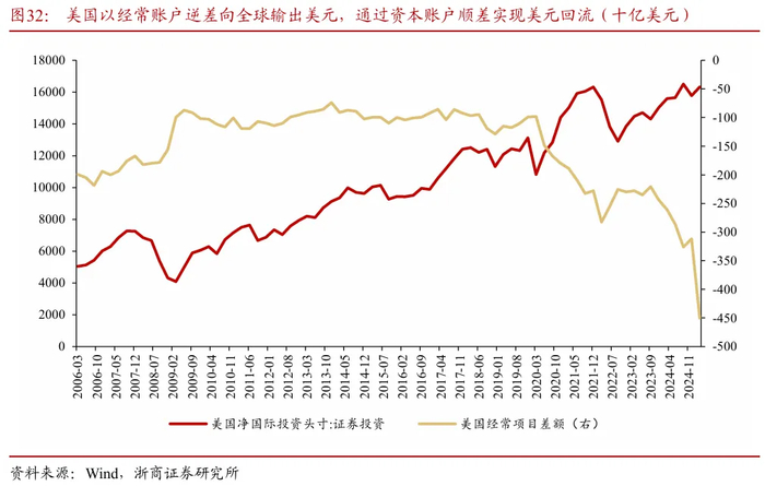 国际格局正在寻找新秩序。美国长期以经常账户逆差的形式向全球输出美元、征收全球铸币税,并通过资本账户顺差实现美元回流。2024年,美国经常账户逆差达到1.19万亿美元的历史极值,同年资本账户当中外资持有美债规模新增5731亿美元。尽管美国充分享受着美元霸权带来的利益,但长期的贸易逆差也使得美国经济和产业逐渐空心化,“脱实向虚”情况愈发严重。与此同时,部分经济体经历了“美元潮汐”的冲击之后逐步将储备资产从美元分散到其他货币和资产上以提高抗风险能力。持续的产业空心化、美元地位弱化、财政负担不断加重等因素,正在加剧美国经济的脆弱性,美元霸权的根基逐渐松动。2000年至2025Q1,美国私营部门制造业就业人数占比从15.7%降至9.4%,美元占全球外储份额比重从71.5%降至57.7%。