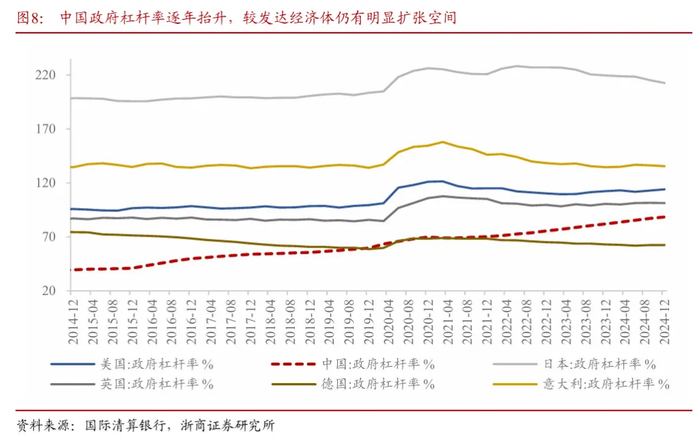 中国政府杠杆率较发达经济体存在明显提升空间。截至2024年12月,中国政府杠杆率为88.4%。对比而言,日本 、意大利、美国、法国及英国对应政府杠杆率分别为212.5%、135.5%、114.1%、113.1%和101.4%。