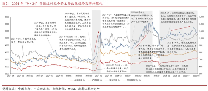利好政策出台,呵护资本市场:2024年9月24日,央行举行新闻发布会,公布三大重磅政策,包括降低存款准备金率和政策利率、降低存量房贷利率,统一房贷最低首付比例、首次创设专门针对股票市场的结构性货币政策工具(互换便利和股票回购、增持专项再贷款),为本轮牛市提供“政策支持”以及“流动性宽松”支持。2024年9月中央政治局会议和2024年12月的中央经济工作会议,分别提到“要努力提振资本市场,大力引导中长期资金入市”、“打通中长期资金入市卡点堵点”。