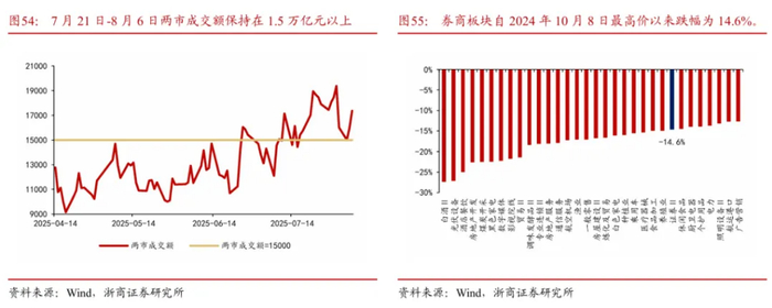 关注金融板块弹性品种券商:市场交投活跃,市场重心抬高,强beta品种券商板块滞涨,或存在补涨可能性。1)两市交投活跃,中线有望看高一线:7月21日-8月6日,两市成交额保持在1.5万亿元以上,处于2025年4月1日以来较高水平,市场交易活跃度较高。万得全A指数亦创下2024年10月8日以来新高,市场做多情绪浓厚,从中长周期来看,上证指数目标点位或已经不再局限挑战2024年10月8日的高点3674点,作为强beta品种,券商板块有望受益。2)券商板块滞涨或存在补涨需求:我们梳理了申万二级行业自2024年10月8日以来日最高价至2025年8月6日的涨跌幅,证券指数跌幅为14.6%,涨跌幅在申万124个二级行业中排名倒数第25,或存在补涨可能性。