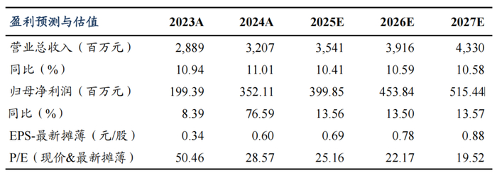 我们维持公司2025-2027年归母净利润预测为4.0/4.5/5.2亿元,当前市值对应PE 25/22/20X,维持“增持”评级。