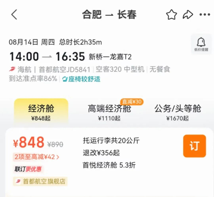 “2019年起,首都航空为方便旅客绿色出行,便捷登机,根据不同旅客的需求定制了多种票价供旅客选择,票价越低,那就没有行李额度;票价越高,行李额度一般会有20kg。比如五折、六折、七折票,这些都有行李额度,但是四折、三折、二折、一折票,就没有行李额度,所以是一个很人性化的设计。”该客服表示。