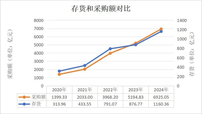 而2024年年末比亚迪仍有1160.36亿元的存货余额,相当于比亚迪在2024年汽车业务收入的近五分之一。