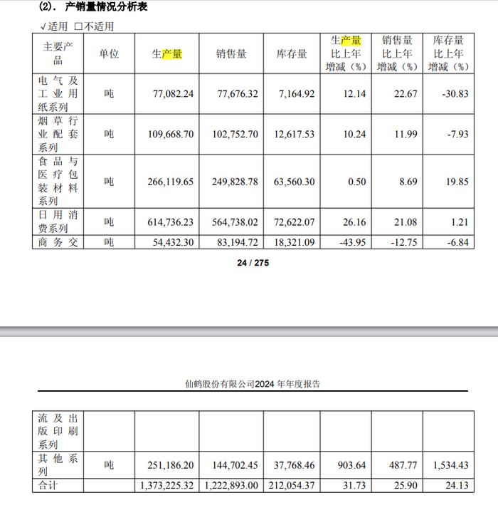 从当前数据来看,仙鹤股份的产能利用率已显疲态。2024年,公司产量137.32万吨,销售量仅122.29万吨,库存增长24.13%,产能利用率不足70%。