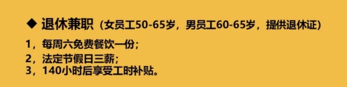 根据麦当劳退休返聘招聘要求,员工需要每周上班三天以上,并且女性年龄在50-64周岁,男性60-65周岁,需提供退休证;福利包括周六提供免费餐饮、节假日三薪,每月140工时以后提供工时补贴等。