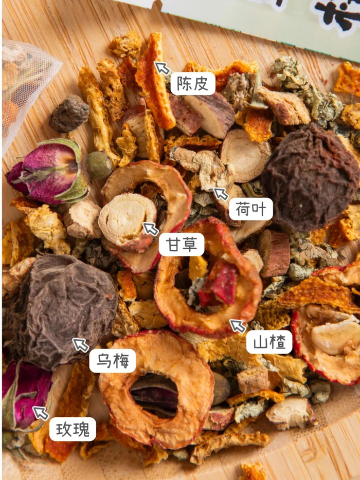 它在传统乌梅茶的基础上,加入了荷叶、重瓣玫瑰,日常刮油、清燥火、缓便秘的好帮手~