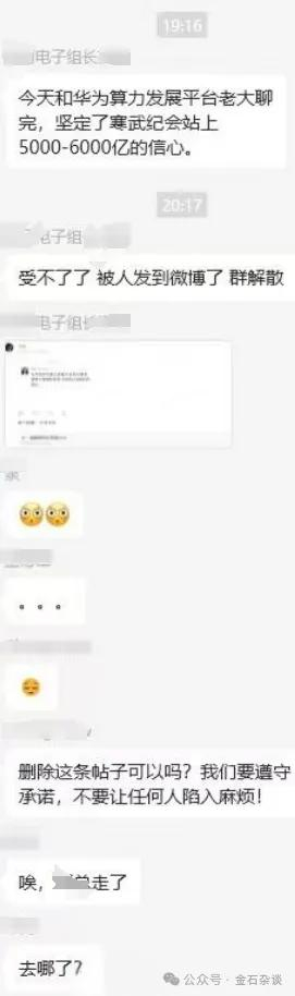 1月9日,再有券商首席吹票寒武纪,他表示:和华为算力发展平台老大聊完,坚定了寒武纪站上5000-6000亿的信心。随后,由于该内容发入微博,该首席随即退出群聊。