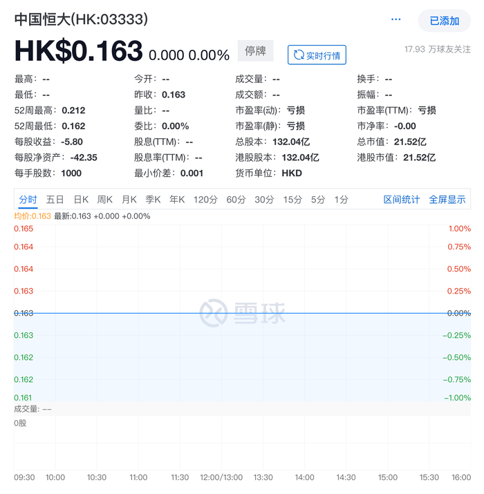截至停牌前,中国恒大已经沦为“仙股”,报0.163港元/股,总市值仅为21.52亿港元。