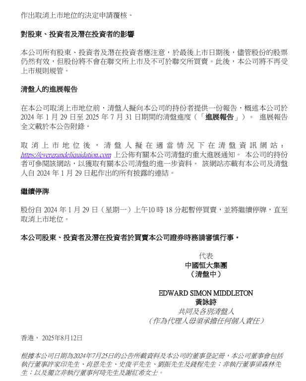 对于清盘进展情况,在中国恒大取消上市地位前,清盘人拟向公司的持有者提供一份报告,概述公司在2024年1月29日至2025年7月31日期间的清盘进度。