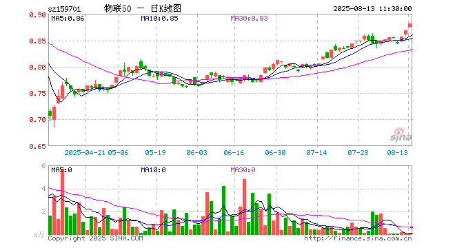 8月13日,截止午间收盘,物联网ETF招商(159701)涨1.50%,报0.881元,成交额6.03万元。物联网ETF招商(159701)重仓股方面,立讯精密截止午盘涨0.97%,汇川技术涨0.81%,中际旭创涨8.76%,豪威集团涨2.94%,中兴通讯涨1.82%,美的集团涨0.39%,科大讯飞涨0.45%,海康威视涨0.85%,海尔智家涨0.27%,兆易创新涨0.42%。