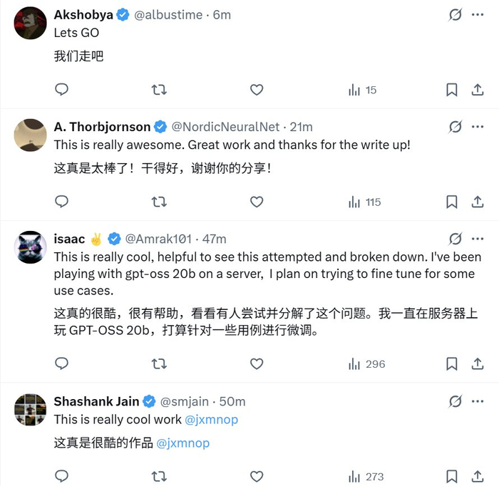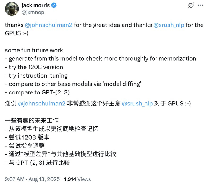 未来,Morris 表示还会更彻底地检查 gpt-oss-20b-base 记忆的内容,并会试试逆转 gpt-oss-120b,另外他还将尝试指令微调以及与 GPT-2 和 GPT-3 进行比较。