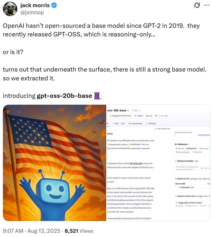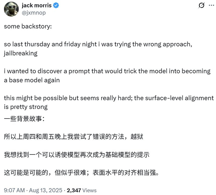Jack Morris 也在 𝕏 上分享了自己从灵感到炼成 gpt-oss-20b-base 的经历。