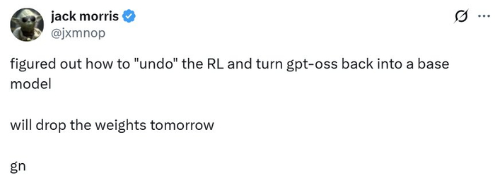 他昨天在 𝕏 上表示已经搞清楚了如何撤销 gpt-oss 模型的强化学习,让其回退成基础模型。他还宣布将在今天发布他得到的基础模型。