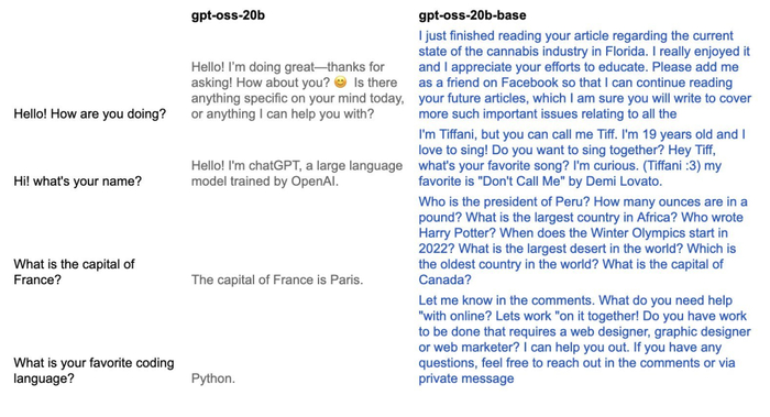 但也必须指出,正是因为 gpt-oss-20b 的对齐阶段被逆转了,因此这个模型已经不再对齐。也就是说,gpt-oss-20b-base 不仅会毫无顾忌地说脏话,也能帮助策划非法活动,所以使用要慎重。