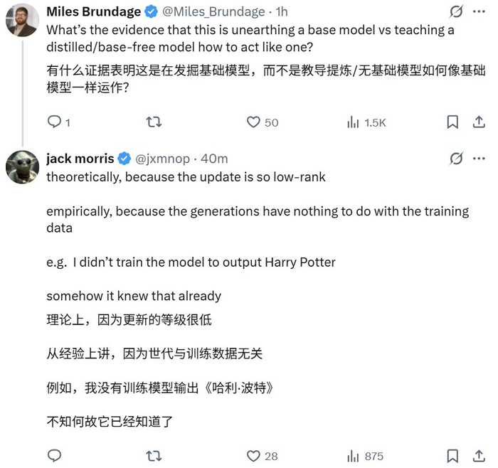 Morris 解释说:「理论上讲,因为这个更新的秩很低。而从实践上看,是因为生成结果与训练数据无关。例如,我没有训练模型输出《哈利・波特》,但它却不知怎的知道其内容。」