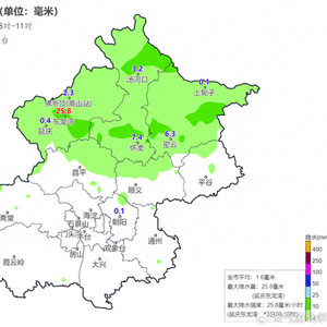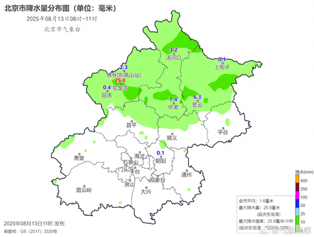 13日08时-11时,最大降水量出现在延庆东龙湾25.8毫米。