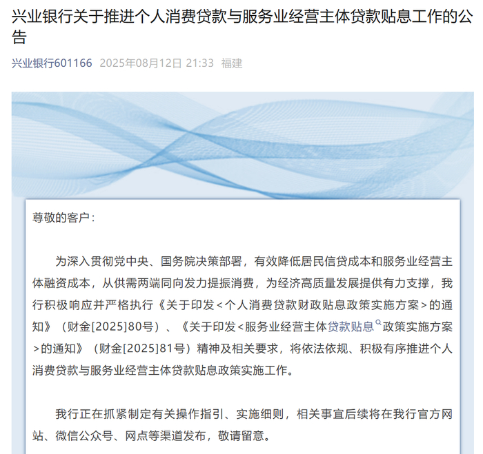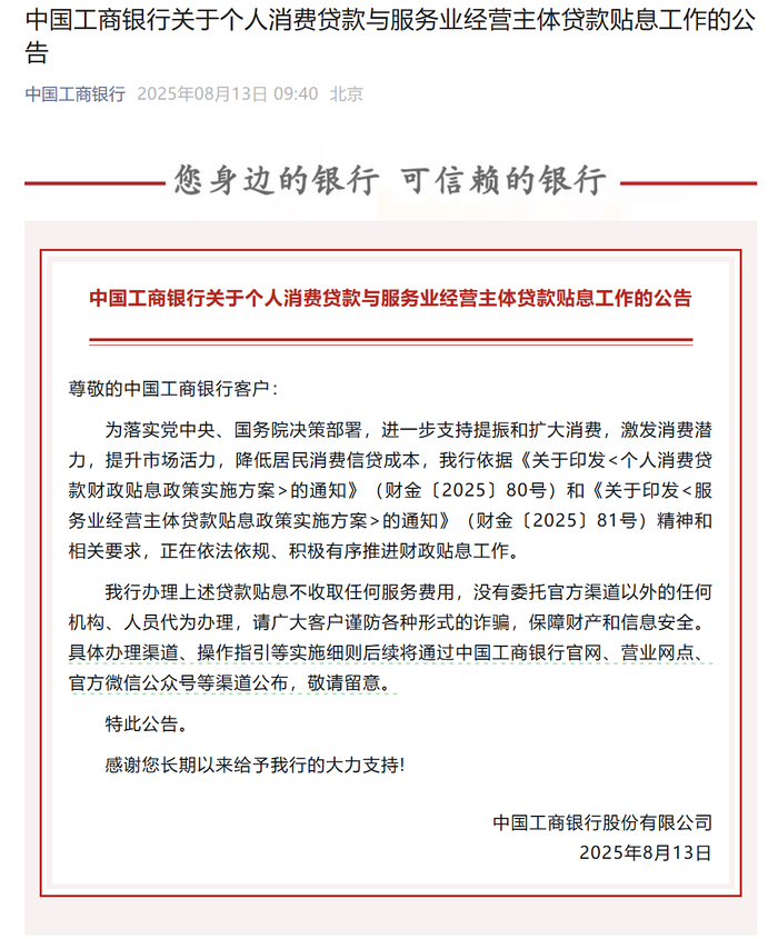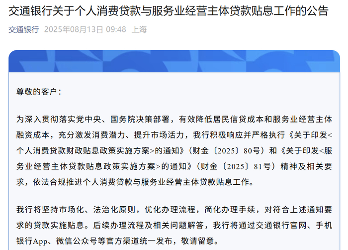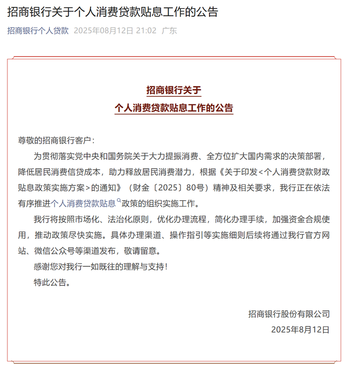 8月13日,国有大行陆续跟进,对个人消费贷款财政贴息工作进行公告。