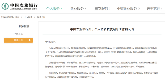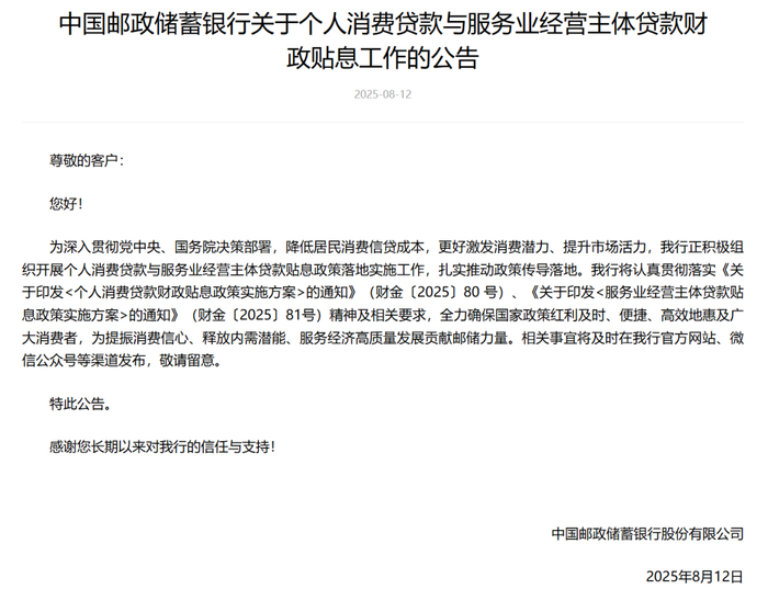 消息发布后,农业银行、邮储银行率先响应,宣布将按照市场化、法治化原则,自2025年9月1日起,对符合要求的个人消费贷款实施贴息。