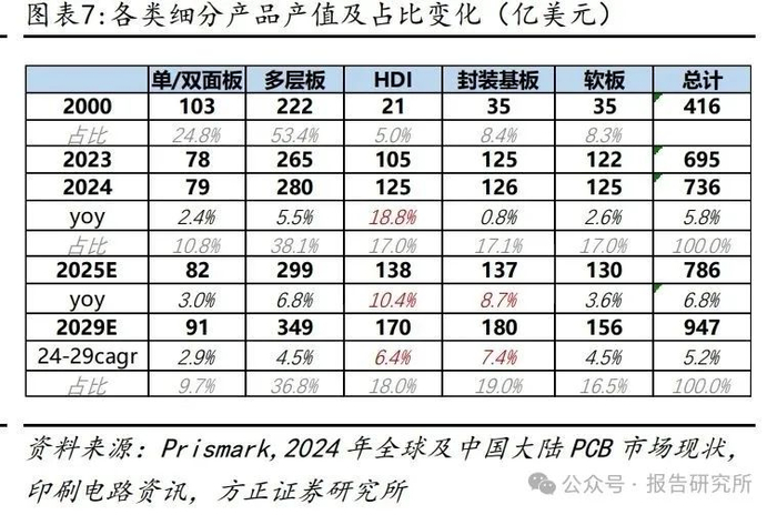从细分产品增速来看,虽然 2024 年多层板总体产值同比仅增长率在个位数,但 18+层多层板产值和产量分别同比增长了 25.2%和 35.4%,是所有细分产品中增 长最快的。而排在第二的 HDI,虽然应用于智能手机的 HDI 增长幅度不大,但人 工智能服务器、高速网络、卫星通信和其他应用对 HLC+HDI 板的需求提升,驱 动 HDI 实现同比增长 18.8%。 随着电子产品向小型化、轻薄化、高性能化方向发展,PCB 不断朝着高密度、高 精度、高可靠性方向迈进,封装基板、HDI、FPC 等技术含量高、附加值高的 PCB 产品渗透率持续提升。
