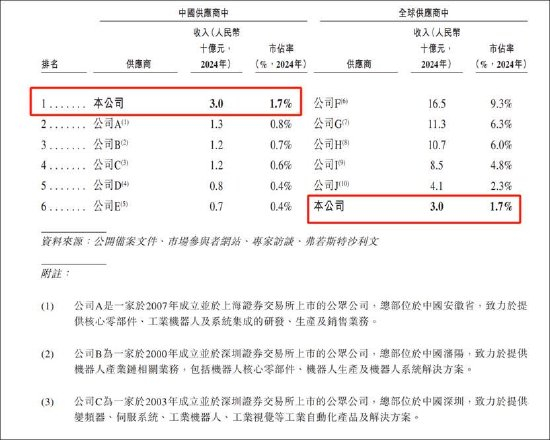 根据招股书显示,按2024年收入计,埃斯顿于全球工业机器人解决方案市场在国内供应商中排名第一,于全球工业机器人解决方案市场在全球所有供应商中排名第六。