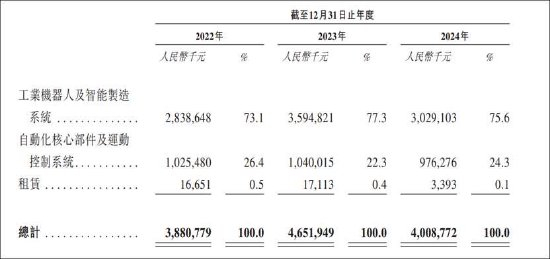 公司的工业机器人及智能制造系统为公司基本盘。2022年、2023年及2024年,公司销售工业机器人及智能制造系统产生的收入分别为人民币28.39亿元、人民币35.95亿元及人民币30.29亿元,占当年总收入的73.1%、77.3%及75.6%。