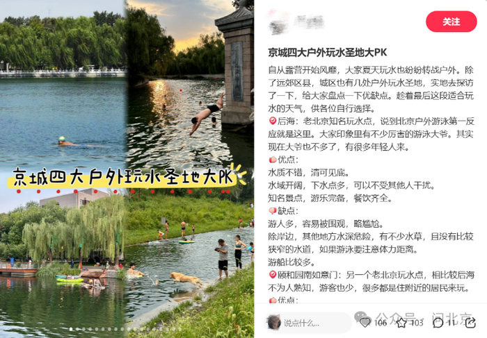 正值三伏天,烈日炎炎之下,户外水域成了市民消暑纳凉的好去处。在网络平台上搜索 “北京公开水域”“户外玩水” 等关键词,便能获取许多相关内容——“8处合法开放游泳点位”、“北京城内隐藏的天然泳池”......有的攻略不仅详细罗列了热门地点、注意事项、适宜活动,还总结了北京市内的“8个官方亲水点”。那么,这一表述是否准确呢?记者咨询了东城、朝阳、西城等区的水务部门。