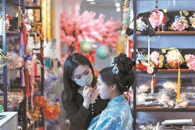 “紧跟剧集热度,我们也在研究角色妆造。”90后老板娘小隋受琼瑶剧影响,自幼喜爱化妆,如今店里的配饰设计——从缀满粉花的旗头到与刺绣呼应的发簪都由她一手操持。相比还原史实,她更看重“出片感”:“每个顾客在照片里都要美美的。”