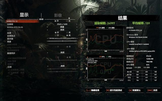 《古墓丽影:暗影》:默认高画质,平均帧率 159fps,最高 262fps,最低 138fps,流畅度媲美电竞游戏。