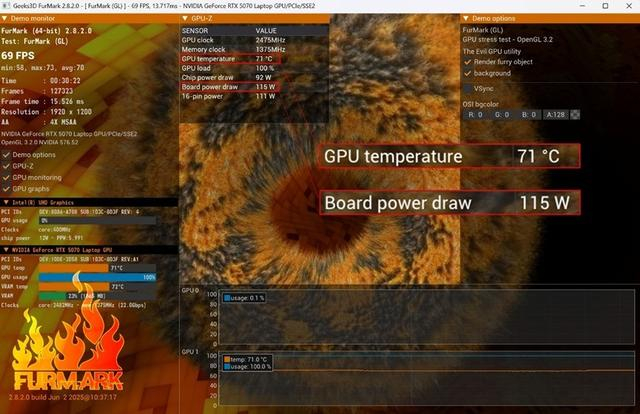 单独的FurMark 显卡压力测试中,RTX5070 Laptop 的功耗锁定在115W,封装温度71℃,核心频率稳定在2475MHz,30分钟测试内帧率波动不超过3%,表现出极佳的稳定性。