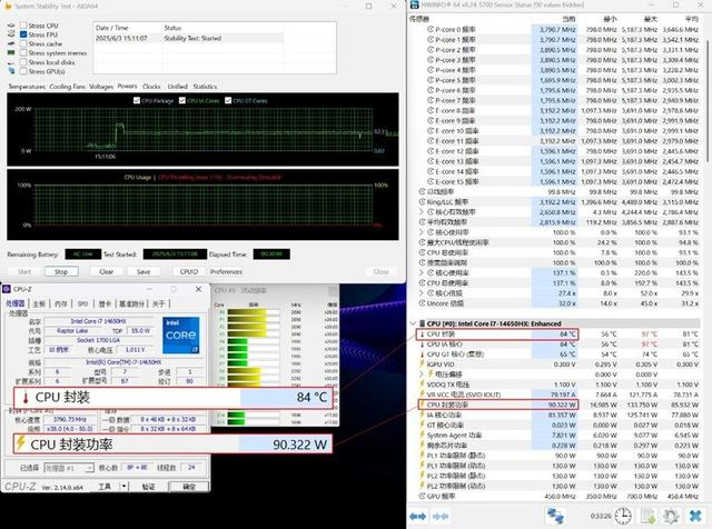在30 分钟AIDA64 处理器压力测试中,i7-14650HX的功耗稳定在90W 左右,封装温度控制在84℃,核心频率维持在3.6GHz(P核)与2.9GHz(E核),无明显降频。这意味着即使在持续高负载的渲染任务中,处理器也能保持高性能输出。