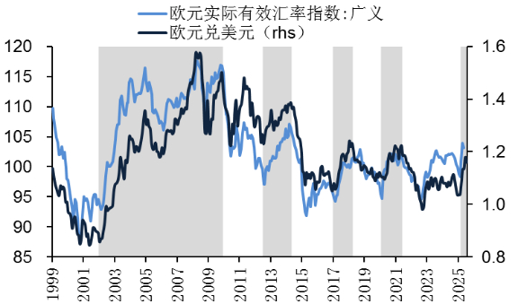 强欧元的观察一般基于欧元兑美元汇率的走势,但由于欧元在美元指数的权重超过五成,在做空美元的同时,欧元往往会被动升值,为进一步准确观测欧元的周期,加入欧元对一篮子货币走势的观测,即广义的欧元实际有效汇率指数。从历史上看,欧元兑美元走强,并伴随欧元汇率指数的显著抬升,自1999年欧元正式诞生算起,典型的强欧元时期有如下三个:
