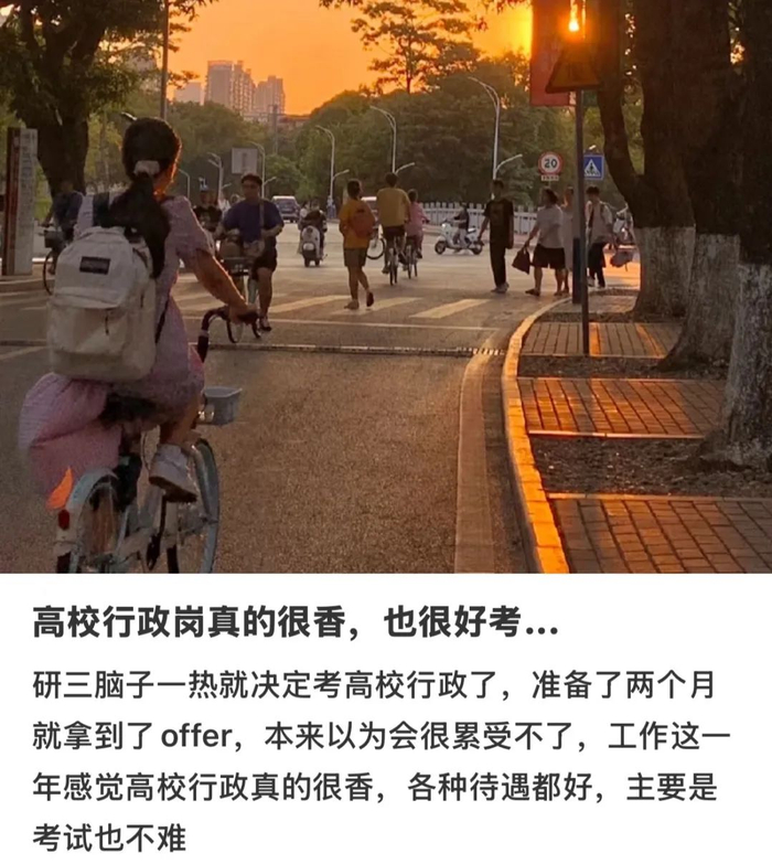 “更何况,进大学当行政老师,也有不少隐藏的优势。比如朝九晚五不加班,可以享受寒暑假,也不用像传统的大学老师那样卷学术和科研。”