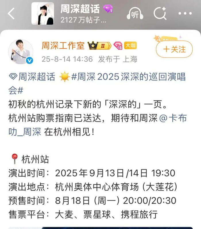 据工作室,杭州站的演出时间为:2025年9月13日/14日 19:30;演出地点:杭州奥体中心体育场(大莲花);预售时间:8月18日(周一)20:00/20:30。