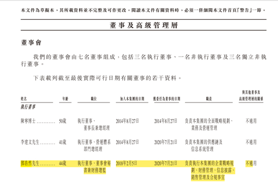 邓浩然先生,44 岁,于 2018 年 2 月加入本集团,自2020 年 7 月起担任本公司董事、财务总监兼董事会秘书。彼于 2025 年 7 月获调任为执行董事,并于 2025 年 7 月获委任为联席公司秘书。彼主要负责执行本集团的企业战略规划、财务管理、信息披露、销售管理及合规事宜。