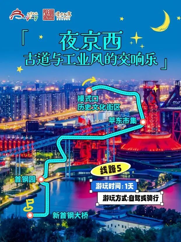 线路特色:走进模式口历史文化街区,来一场跨越时空的文化漫游,打卡法海寺、承恩寺等景点,周五、周六在模式口公园对月高歌;暮色将至,在苹东市集的烟火气氛围中,畅享夏日夜晚的酣畅淋漓;探索硬核工业风的首钢园,看工业遗存与科技体验的酷炫空间,周末还可以观看流行音乐演出;夜色降临,去新首钢大桥来一场沉浸式骑行。