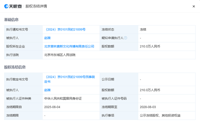 每经AI快讯,天眼查APP信息显示,近日,北京普林赛斯文化传播有限责任公司新增一则股权冻结信息,被执行人为赵薇,冻结股权数额210万元人民币,冻结期限为3年,执行法院为北京市东城区人民法院。