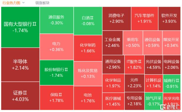 盘面上,液冷概念爆发,欧陆通、川环科技等十余股涨停;PEEK材料板块走高,国际复材20%涨停;PCB、电子元件板块冲高,中富电路、生益科技、方正科技等多股涨停;券商概念午后拉升,长城证券、天风证券等多股涨停;玻璃玻纤、虚拟机器人、电子化学品及风电设备等板块涨幅居前。另外,银行股逆市下跌,中国银行、民生银行、光大银行等多股跌逾2%。