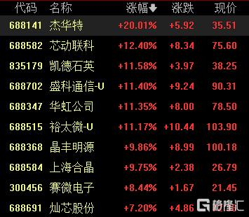 半导体股走强,杰华特涨20cm涨停,芯动联科涨超12%,凯德石英、盛科通信、华虹公司涨超11%,上海合晶、赛微电子等跟涨。