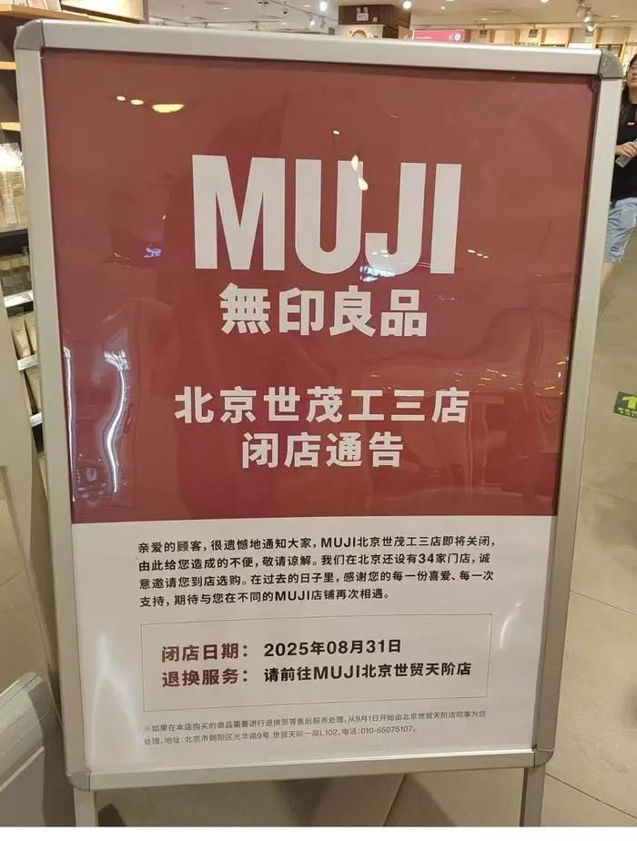 有网友在社交媒体称,MUJI无印良品在北京的世茂工三店将终止营业。据网友晒出门店张贴的“闭店通知”显示,闭店时间2025年8月31日,退换货服务请往MUJI北京世贸天阶店,“很遗憾通知大家,MUJI世茂工三店即将关闭,由此给您造成的不便,敬请谅解。我们在这个城市还设有34家门店,诚意邀请您到店选购。”