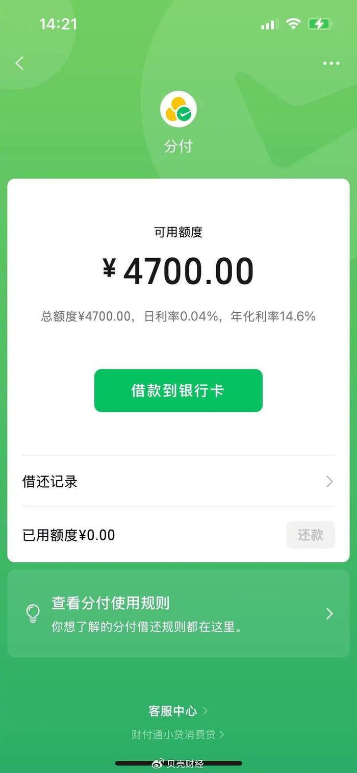 贝壳财经记者进入分付页面看到,该产品标注了“消费可用”“按日计息”“随时可还”的字样。点击“查看我的额度”后,记者获得了4700可用额度。同时,页面显示“日利率0.04%,年化利率14.6%”。