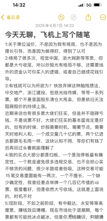 6月,他还谈了自己对股票以及炒股的看法,分享给大家,核心观点:不是格局就能赚钱,也不是有钱就可以任性赚钱,炒股需要时机,只做扫板票,不做低吸,目前处于退潮期,不要总怨天尤人,人都要学会进步。