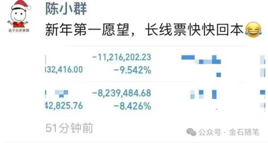 当然了,陈小群不是只有盈利,他也有亏损。2025年伊始,他的新年第一愿望,长线票快快回本。看其持仓一个票亏损1122万,一个票亏损824万。