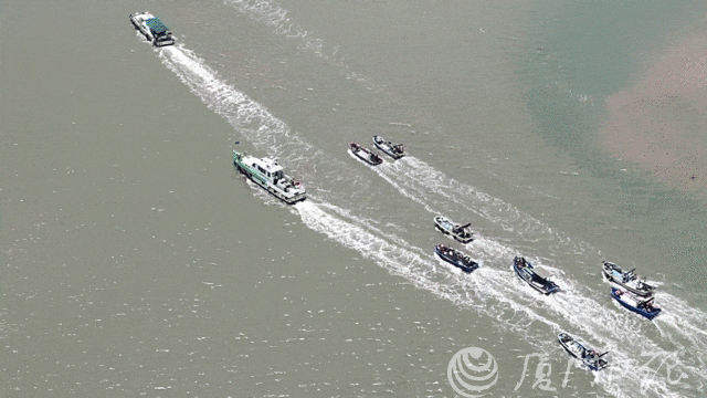 11时40分,离开渔的时点还不到半个小时,翔安区金海街道欧厝码头,就已经聚集了许多等候出发号角的渔民,在他们身后的海面上,一艘艘装备齐全的渔船排列整齐、整装待发。