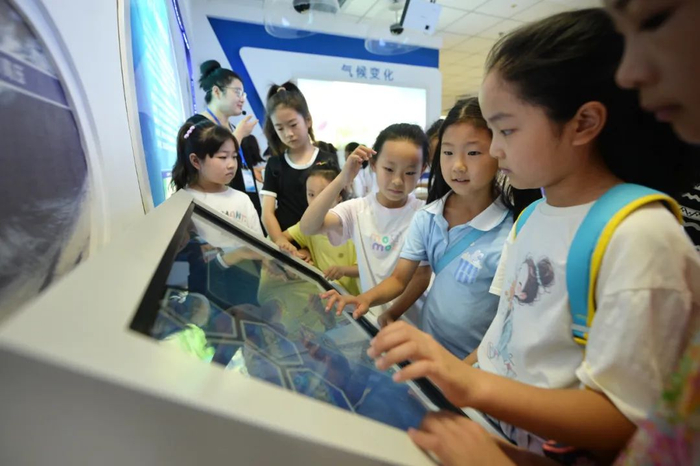8月10日,山东省青岛市城阳区景明学校,小朋友在学习气象知识 / 新华社发(王海滨摄)