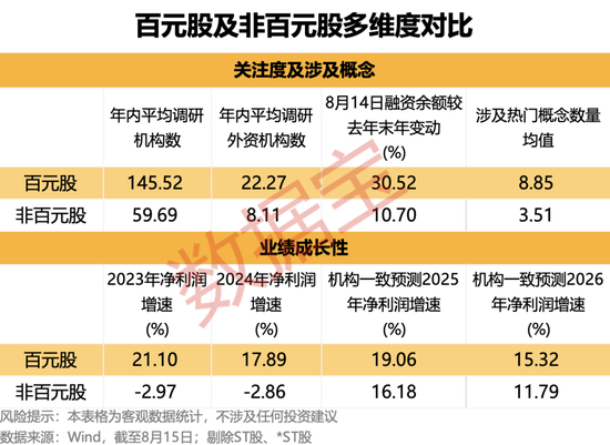 与此同时,百元股的外资机构关注度也更高。杠杆资金方面,截至8月14日,百元股最新融资余额较去年年末增幅超过30%;而非百元股整体增幅不足11%。