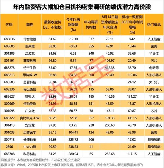 2. 年内获得30家及以上机构调研,且最新(8月14日)融资余额较去年年末加仓超30%(含新进融资融券的标的);