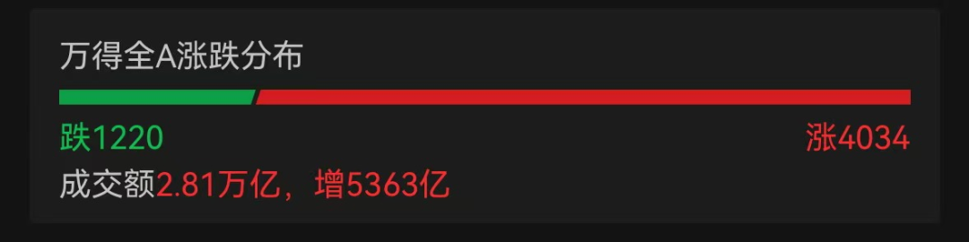 沪深两市全天成交额超2.8万亿,成交额再创年内新高。全市场超4000只个股上涨。